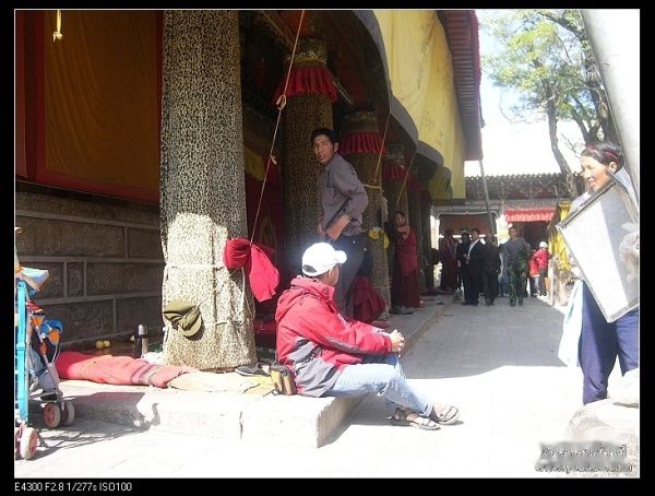 大殿旁的墙角里,一个皮肤黑红,扎着几绺小辫的女孩依偎在母亲的怀里,静静地喝着酥油茶,闪亮的大眼睛注视着我们这些匆匆过客。母亲的手抚摩着女孩的额头,眼睛却一直注视着佛殿的方向——女孩的父亲正在那儿磕头还愿。 在一个虔诚的叩拜后,女孩的父亲缓缓站起,朝他们走去。而母亲也在这时站了起来。一家三口相互笑了笑,那么的默契温暖。当女孩躺在父亲宽大臂膀中的同时,在刚才父亲叩拜的木板上,母亲合十的双手正举向头顶……