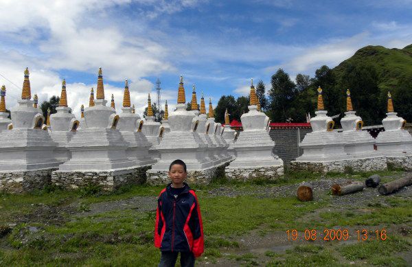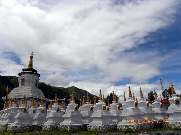 不想吃饭,随便吃了点干粮,司机说是在此休息半小时,便出去转转,过了前面加油站,路边一片潔白高聳的塔林兀然映入眼帘,瓦蓝的晴空下纯净的白塔,加上飘扬的经幡,给这片纯自然的风光增加了浓浓的民俗风情。