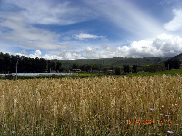 宁静开阔的谷地,分布着大片大片的麦田,远处,矗立着星星点点的藏家民居,蓝天白云静默无言,间或有藏家孩童的笑声随风送入耳中,那一刻不禁想:这,莫非就是人间乐土?