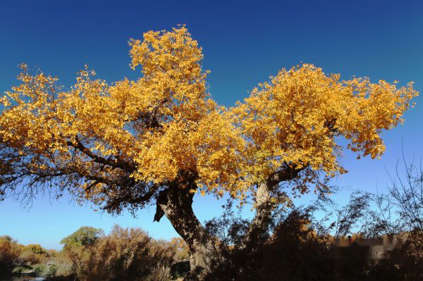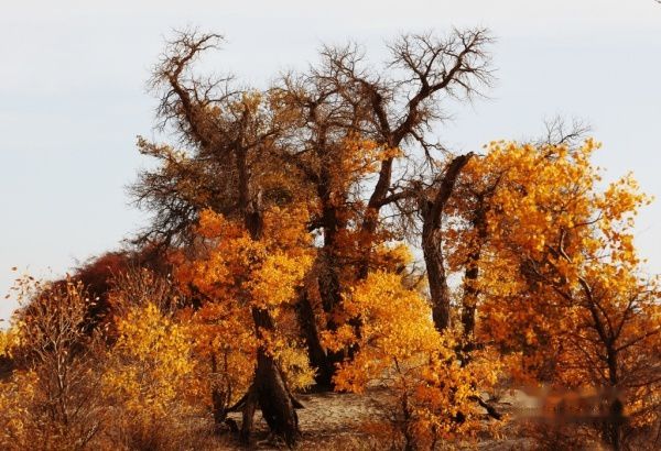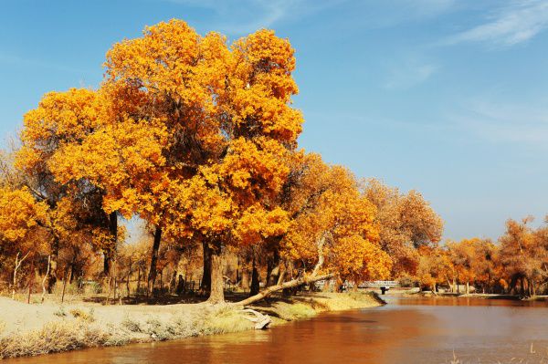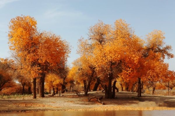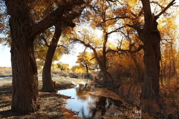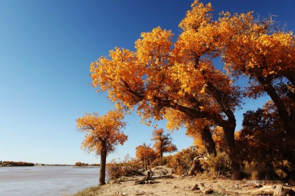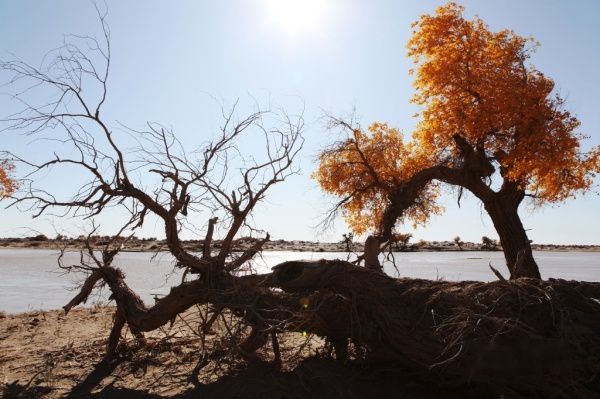 四季轮回,时光在你的眼前无声地变换着色彩,冬季的冰雪、春天的嫩绿、夏日的炎热、秋天的金黄,每一个变化都是那么的准时和灵动,当我走进额济纳旗时,湛蓝的天空、金色的胡杨让你感受了一个童话般的世界!行走在额济纳的胡杨林里,河水、树影,斑斑点点洒落在树林中的阳光,透着那么的诗情画意,当渐渐落下的夕阳将美丽的胡杨树渲染上一层金红色的光晕后,我们感受到了冬日来临的阵阵寒意!就要离开额济纳了,初起的秋风携带着巴丹吉林沙漠的沙子形成的沙尘暴在胡杨林中穿行,胡杨树那金黄色的树叶纷纷飘落,秋叶——它到了最凄美也最悲壮的时刻,割舍自己等待春天。我们期待着下一个轮回!
