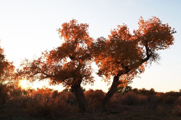 夕阳将美丽的胡杨树渲染上一层金红色的光晕