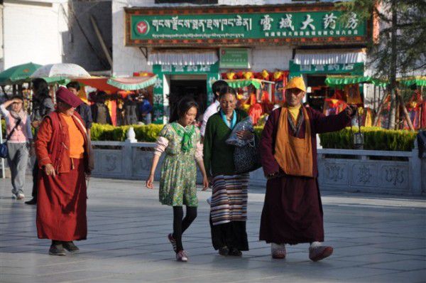 坐在大昭寺广场上晒着太阳发呆,看形形色色、穿着各色服饰的人群熙来攘往,是我找到的一种放松休闲的方式,在这里仿佛心已不在尘世中,那是一种喜悦与感动。