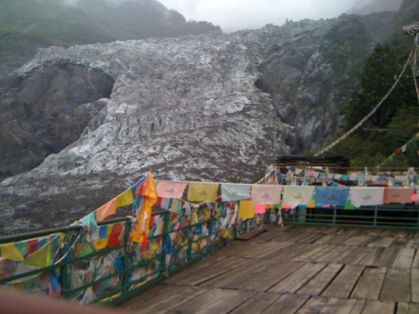 9点半抵达明永村,带好干粮(实际上是巧克力),进入检票。但按本地居名的说法:这是座神山,上冰川朝圣必须步行上山以示心诚。所以选择了自行徒步8公里运动。事实证明徒步是很好的运动,具有一定的危险性、还需随时躲避骡子的冲撞,恶臭的骡粪便。明永冰川是卡瓦格博峰下其中一条长长的冰川,这是一条低纬度热带季风海洋性现代冰川,山顶冰雪终年不化。很是壮观。虽然雨后的小路有些泥泞,但毅力阻挡不了热情驴们的虔诚。穿小路手脚并用着,于中午12点抵达太子庙稍作休息。10分钟后继续攀登至海拔3100米的最顶观景台。经过最后的冲刺1点钟终于抵达明永冰川观景台,冰舌往下延伸到海拔2800米处,如一条银鳞玉甲的游龙,从高高的雪峰一直延伸到山下,直扑澜沧江边非常震撼。拍照,休息摆pose。稍作休息继续徒步返回,上山容易下山难,随时都有被滑倒的险境。走走停停3点半左右回到目的,领队已经急不可耐的催促了。午餐在明永村口解决,套餐200元,10个菜品。量蛮多,味道就一般般了。