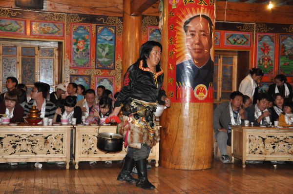 Day 5:早八点奔子栏镇出发直接奔赴香格里拉松赞林寺,又逢堵车,修路,抵达香格里拉时间是下午1点钟,餐后直接赴松赞林寺。从香格里拉县城至松赞林寺驱车30分钟左右即可到达。购票后需成景点大巴进入寺庙。里面有免费的讲解都是藏传佛教,可以随意供奉香火(便宜的200),供奉酥油灯(有10元小的)。整个寺庙的游览大约2小时左右,从寺庙入口进入最高顶,海拔是3100,攀爬楼梯有些高反,特需注意。在寺院游览最好听从领队的要求,不要随意用单指指点佛像,正确的姿势应是右手五指并拢,这也是藏区的一种对佛教的尊敬与信仰。松赞林寺的主殿正在维护,目前不能进入参观。主殿两边的大殿分别供奉着宗喀巴大师和释迦摩尼像。寺院有许多僧舍,最好不要擅自进入。寺院有很多殿堂不允许拍摄,请自重。帽子,眼镜(指太阳镜)在进入殿堂的时候要摘掉,这也是对佛祖的一种尊敬吧。寺院购物的话,自行定夺,随意就好。5点钟寺院出发,寺院门口有一只全白且号称全球神牛的全白色牦牛,可以合影留念。(10元一张)。你可以将相机设置为连拍哈哈哈。。。。6点钟抵达香格里拉独克宗古城旁的四方商务酒店,check in,稍作休息准备8点钟藏民家家访(属于自费项目,人均100.可以砍价至小孩子免费,看你本事了)。说是藏民家,其实就是政府扶持的一个收费项目而已。来宾站在门口接受藏民递送的哈达,对面有人帮你摄影(后来才知道,经过PS 处理之后,每个人都同一位藏族同胞合影留念,20元一张,要不要随意,反正我是没要)。藏民家访实际就是歌舞晚会,2小时左右。我们两车人总共缴纳了1500元,一只烤小牦牛+半只烤羊,酥油茶、青稞酒,糌粑,麻花,奶酪,味道嘛,你可以大胆进行尝试,反正我提前跟你说了哈哈哈。晚会主持的小男生叫格桑杰出过单曲《带你去流浪》有兴趣可以百度。10点结束,速回酒店休息备战明日的普达措。宿:香格里拉四方商务酒店