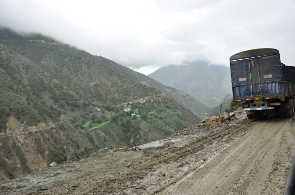 路遇堵车,泥泞的道路上相互错车,悬崖就在眼前 汗~~~~