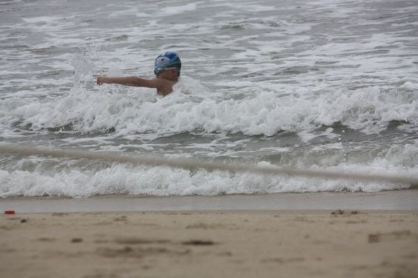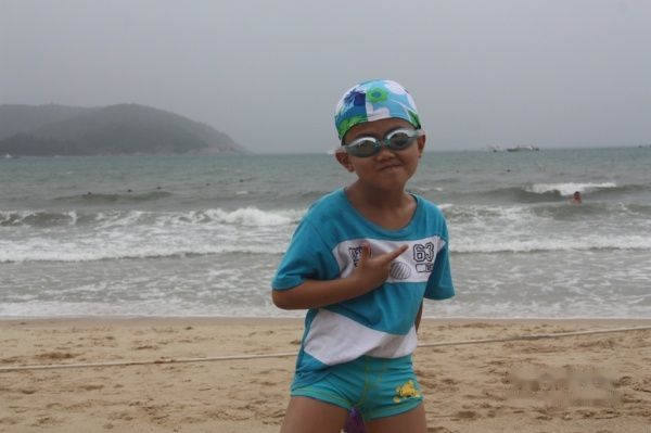 沙滩边儿子下水前的泳装秀: