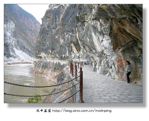 ▽图01:从虎跳峡景区门口到虎跳峡的路途中,栈道都是从山岩中开凿出来,每隔一段距离就会有工作人员提示你尽量靠里行走,以免出现意外险情。