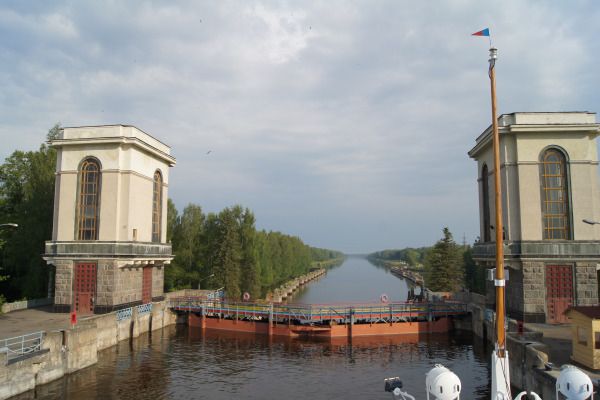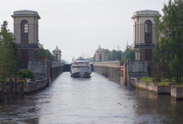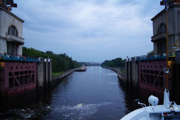 从莫斯科至圣彼得堡一共要经过16道船闸,第一个夜晚就要经过4道,刚开始时我并不知道要过船闸的事,否则晚上会留在甲板上看连续过船闸的。