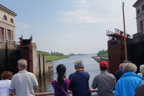 7月3日清晨4点我醒来,发现船停着,登上甲板后才发现游轮正在船闸内等待过船闸。