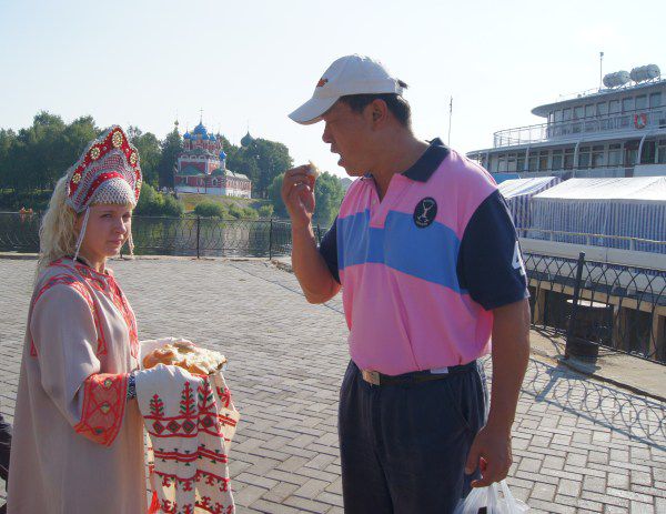 下午6点到达乌格利奇。身穿民族服装的俄罗斯姑娘用迎接贵宾的传统方式——面包沾盐,在码头上迎接远方的来客。