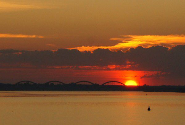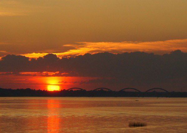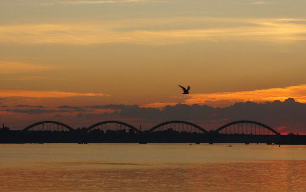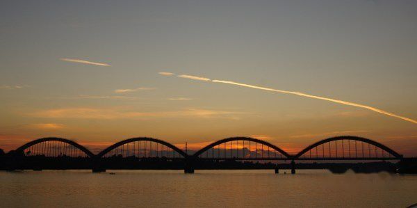 河面上出现了一座拱桥,为伏尔加河的日落景色添上更壮观的一笔。
