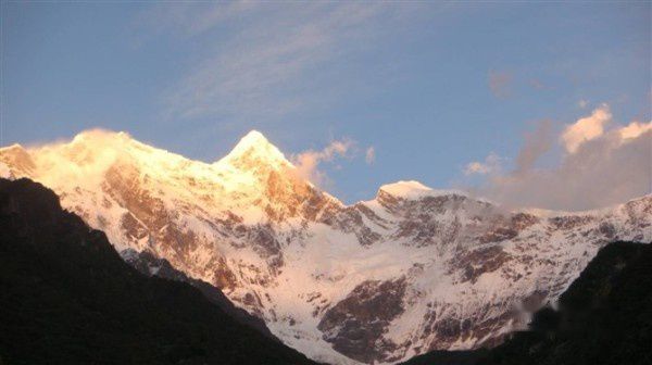 热情的农庄主牵来一匹小白马,小妖换上门巴族女服,飞身上马,在峡谷里飘荡。真是强悍呀,颇有女侠风范,弓剑只能望而兴叹:现在的女人真强,阴盛阳衰呀。刘莲坐在石凳上专心的进行她的绘画创作,我和灯笼拿着相机到处拍照留影,既不能留下就用相机带走他。不知谁大喊一声:快看,南迦巴瓦峰!真的仅仅几分钟时间,遮蔽南迦巴瓦峰的云层越来越薄,高耸入云南迦巴瓦峰在连绵群山簇拥下越来越醒目。只见南迦巴瓦峰峥嵘全显,洁白的雪山直刺蓝天,又似害羞的少女脱掉薄纱出浴。庄主直说我们幸运:一年中只有25天左右能见到南迦巴瓦露出面容,很多人住在他家一个月都没见着,我们刚到就看到了,是有佛缘之人呀。我们站在南迦巴瓦前,等着太阳下山看传说中的‘日照金山’。太阳下山了,整个天空披着红霞,南迦巴瓦被映衬着金光闪闪,农庄里的藏族人铺地祈福,我们也赶紧双手合十,祈福…