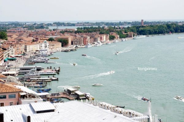 走走停停到了圣马可,都快下午了。广场上都是人,我们排队等候上钟楼,票价8欧,电梯上楼,楼上就能俯瞰威尼斯。