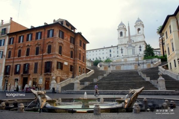 西班牙广场前就是著名的西班牙台阶。该台阶由法国人建造,也是《罗马假日》里的浪漫邂逅处。台阶下是老贝尔尼尼设计的破船喷泉。