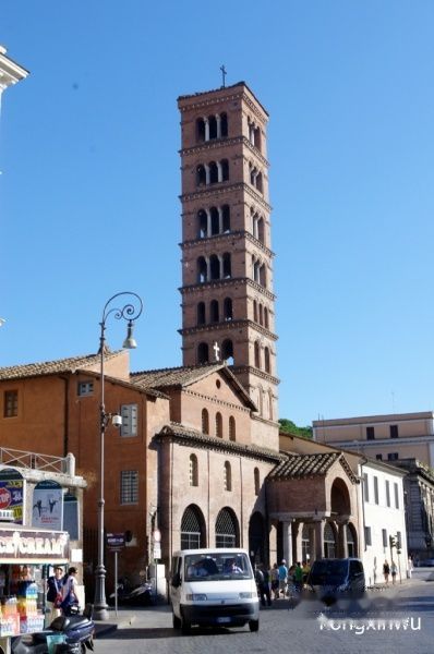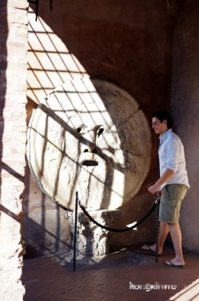 绕过纪念堂,沿着马切罗剧场大道(V.d. Teatro di Marcello)一直走,到路的尽头就能看到科斯梅丁圣母教堂(Santa Maria in Cosmedin),这里之所以名声大譟,是因为一部电影,一个古井盖,这部电影叫《罗马假日》,这个古井盖叫做真言之口(Bocca della Verita)。