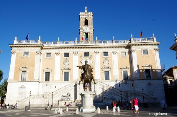 之后一路往上破走,路边的房屋和各式餐厅咖啡店都非常的有艺术气息。一路辗转到达一块空旷地,就是卡比托利欧广场(Piazza del Campidoglio)了,这里也称市政府广场,罗马的标志“母狼与孪生兄弟”的雕像就在这之前。