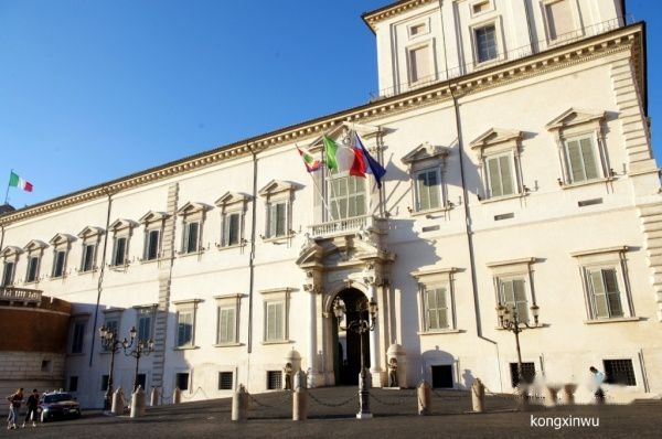 返回到威尼斯广场,沿着广场一侧的道路走,经过克罗纳宫(Galleria Colonna),之后到达克里纳雷宫(Palazzo del Quirinale)。这里曾为历代教皇的住居,从1870年后成为维托·艾曼纽二世等国王的居所。而后从1947年则成为意大利总统的官邸。