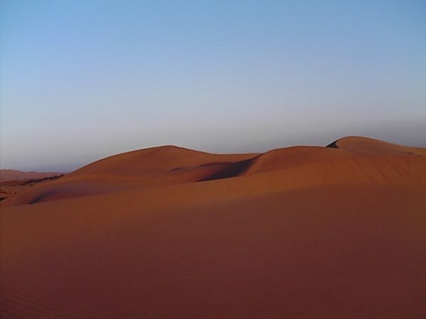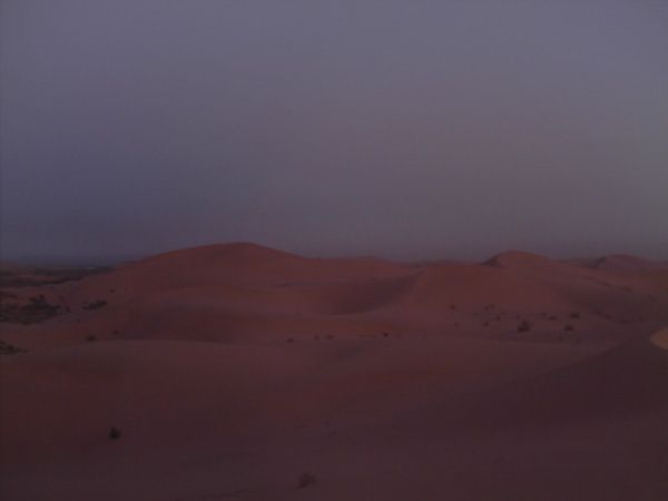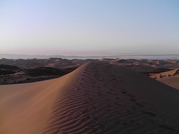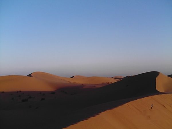 可我们兴奋的心情早已超过了怕冷的恐惧,我们执意打开了车门,向沙漠深处走去,罗师傅看看可能有些不放心,也就跟着来了,我们跌跌撞撞爬到了沙漠深处的沙脊上,急切地等待着日出。