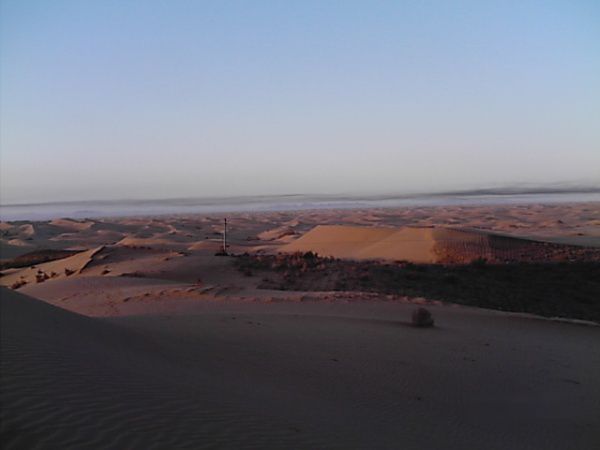 为了看沙漠日出,我和朋友凌晨五点半就起床了,但还时晚了,我们只好急急忙忙,随随便便地收拾一下,奔跑下楼,事实约好的罗师傅已经在楼下等候了。初冬早晨六点的中卫城似乎还在睡梦中,我们在黎明来临前的黑暗中向沙漠出发了。