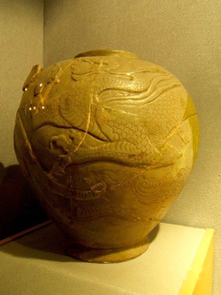 (越窑浮雕四鋬蟠龙罂,五代)