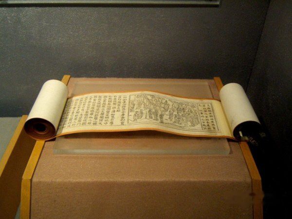 此为木刻雕版印刷而成,图文并茂,发现于雷峰塔塔砖孔內,卷首题记表明这是吴越国王的礼佛供养之物。