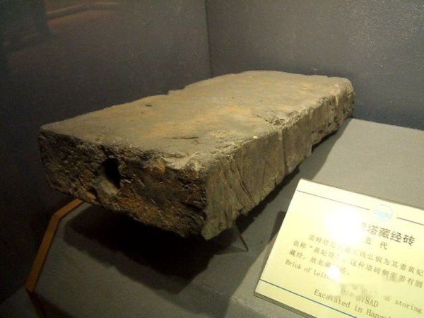 雷峰塔是吴越王钱弘俶为其妻黄妃所建,故也称"黄妃塔"。这种塔砖侧面带有圆孔,孔內藏经,故名藏经砖。