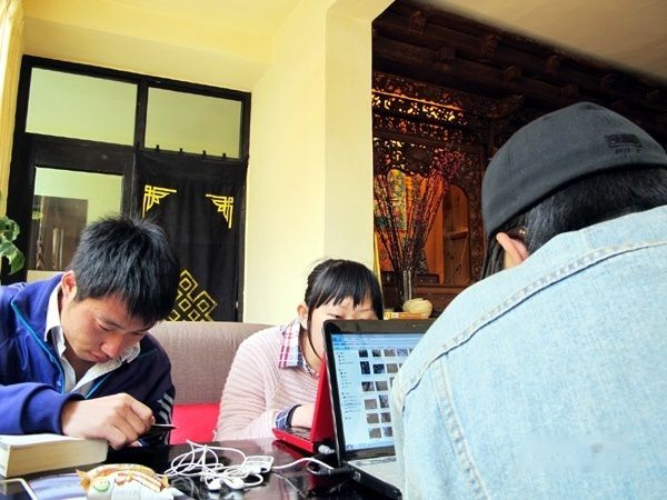 买了邮票、寄了明信片、买了零食,拎着一到包东西回旅社,刚进大厅就看见那三位同学上网、看书……
