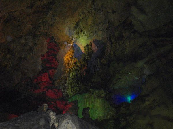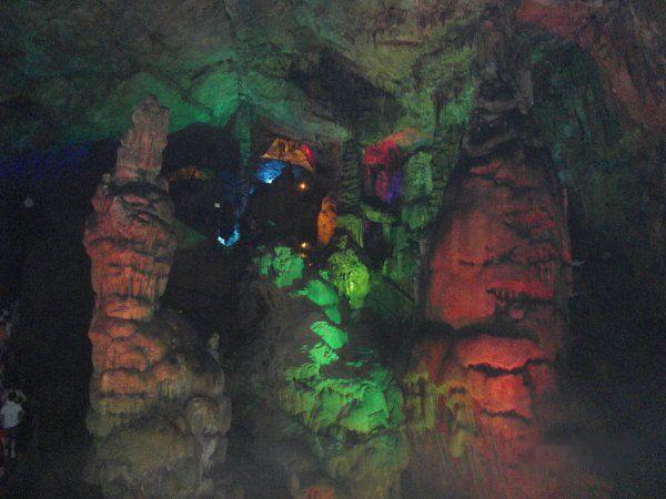 我在想,这个溶洞在未曾人工雕琢、人为开发前,到底是魔界还是仙界呢?这个太阳照不到的地方,永远处于暗夜,没有春暖花开、没有草长莺飞,生命被深深地压抑。是不是诡异阴森才是她的真实特质,她本是来自魔界?而如今,她的邪气被五色灯光妆饰、人声鼎沸掩盖,迷幻神秘的特质被放大,而成为了仙界?