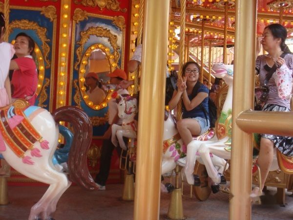 先完最不刺激的旋转木马,你不说,我上去了又跑下来,因为我想起我小时候我爸带我去儿童公园玩,那时我就打死都不敢玩,所以现在还是有点阴影。最后看完他们两个玩,真的不可怕后,才上去玩的。