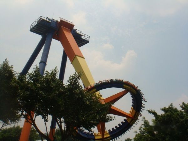 一进 门口看见的就是刺激指数为5的垂直过山车。哇,那尖叫声,听到就心慌,从高空中垂直飞下来,据称是最高的,我也不清楚多少米。然后又头向地飞过去,再来一个垂直飞。我想有心脏病的人,应该只是看到不玩也会发作。嘻嘻,自带了很多零食有点重又加上今天出门没有吃很饱早餐,就先开食吧。一边吃一边思考,我敢玩吗?我敢玩吗?暂时不思考了,先走走在说。