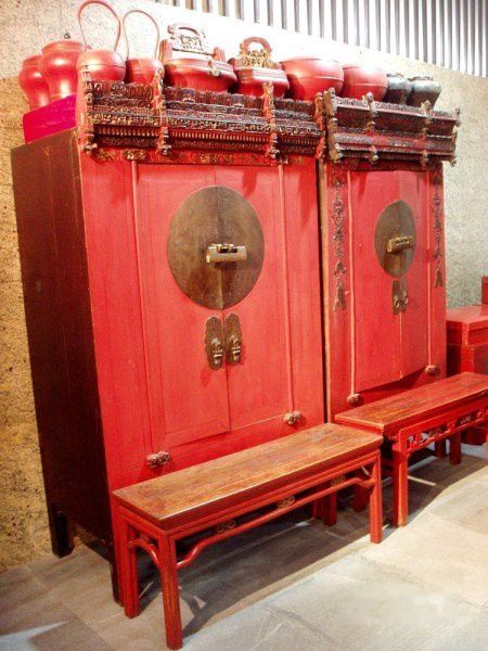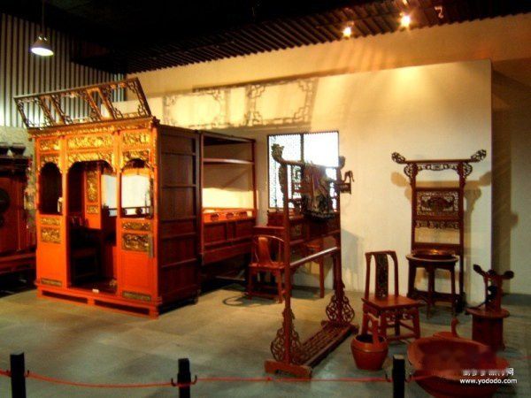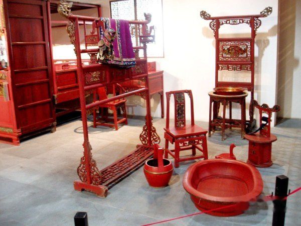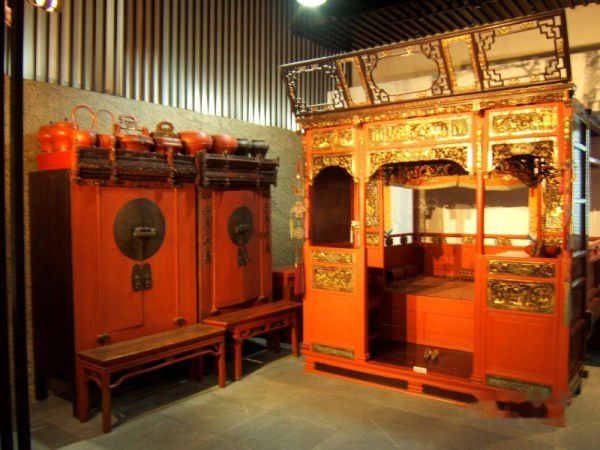 新房內陈列的各种红妆家具,多是采用天然生漆配以朱砂髹制而成,色彩鲜艳亮丽,经久不褪,并集雕刻、堆塑、绘画、贴金、泥金、罩漆等诸多工艺于一身,华贵典雅、鲜妍如新。