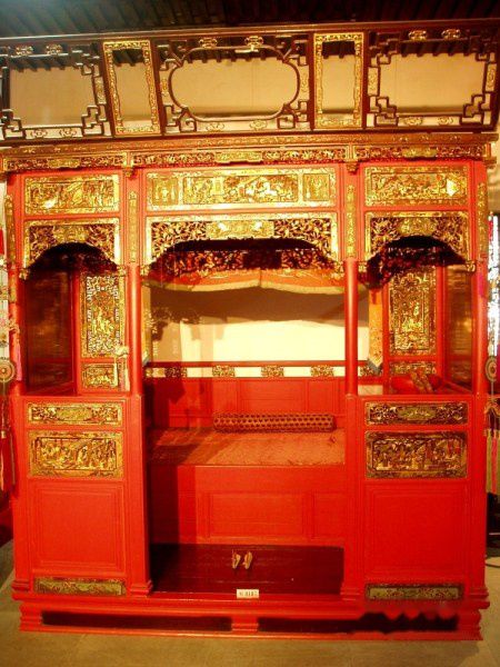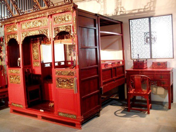 其中最引人注目的是新房核心位置的朱金千工床。宁波人对木床的制作很讲究,俗话说“一世做人,半生在床”,宁波木床必施雕饰,往往朱金雕刻、黄杨木雕、镶嵌螺钿相结合。豪富大户间相互攀比,不惜为此耗银万两,而民间也不示弱,以雕制各式不同档次的凉床来竞豪赛富。其豪华及精致程度,据说恐怕连明清帝王享用的御床也难以与之媲美。