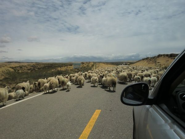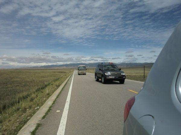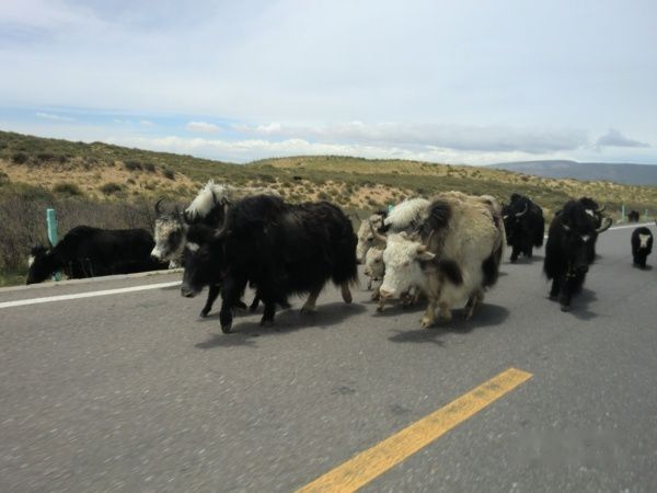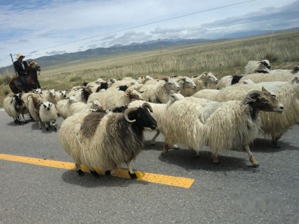 从s310上了环湖东路,路况极好没有人又没有车,速度自然就到了150左右。刚刚跑了十几公里,就碰上了搬家的绵羊和牦牛群,我们的vw没有办法超车,武警开着vw的大哥撵上来一样没有办法对付羊儿,开途锐的小武警为后面考斯特上的领导着想,从左边上了把我们vw挤到路边上,对着羊群的屁股又是拉警笛,又是用车载喇叭吹口哨,但除了我们在看他的笑话外(所谓笑话就是人怕的东西动物不怕,动物怕的东西人又可能不怕,金木水火土,一物降一物),骑在马上的藏胞二口子和他们领导的绵羊牦牛军团根本没有把他放在眼里。