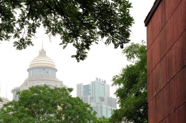 走出玄武湖公园,陪孩子去看鼓楼,我俩沿着中央路向南一路逛去。幸亏一路植有法国梧桐,其茂密的树叶为行人遮挡了炎炎夏日的阳光,好让我们暂时忘却了盛夏酷暑的烦躁。走到‘鼓楼广场前的交叉路口时,隔着中央路,为儿子指看了坐落于马路对面(西边)的大钟亭,也算到此一游过了。转回身来,抬头仰望、欣赏了矗立身旁的中国第二、世界第七高楼——紫峰大厦,有幸近距离地亲近了这个南京市的新地标。横穿过中山路之后,我们站在路边略微停留了几分钟,浏览了中山路上车水马龙的繁忙景象,当然也没有忘记欣赏一下道路两旁那些饱经历史风霜、依然郁郁葱葱的梧桐树。接下来的景点就是鼓楼,的确,自己已记不清上一次到鼓楼是哪个年月了,故头脑中留有的鼓楼印象已经是相当淡漠了。由于树木环抱,我们直到进入鼓楼公园的大门时方才能够一睹其尊容,说实话,感觉蛮失望的。本来距离和空间就相当局促,再又是仰视,观赏效果自然就不够理想;另外,当前鼓楼内部的房间都被各种展出占用,而所展的内容恰恰又是和鼓楼不相关的,看上去总觉得怪怪的、不是滋味。此地此景,不由怀念起西安的鼓楼来,一样的建造年代、一样的景观名称,但是两者的可看性上相去甚远(仅是我个人观点),毕竟西安鼓楼是全国重点文物保护单位,也算是名至实归吧。
