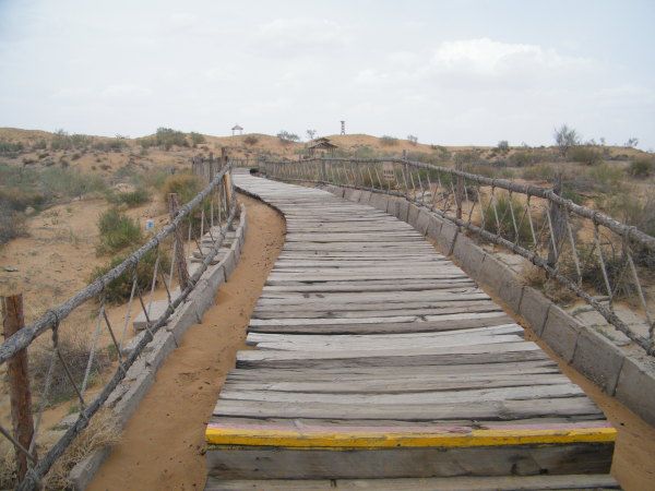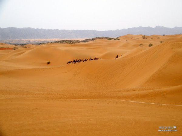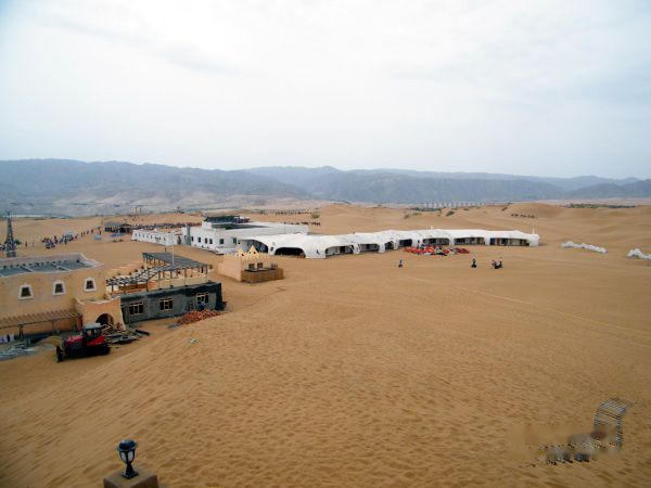 从沙坡头正门乘坐电瓶车或者步行穿越木栈道,就到了北区腾格里景区的入口处。这里有大漠驼队,卡丁车,越野车等各种供游客娱乐的工具,我对这些娱乐大众的东西不感兴趣,独自甩开步子往前走下去,不过几百米就到了景区的北端——观海亭。