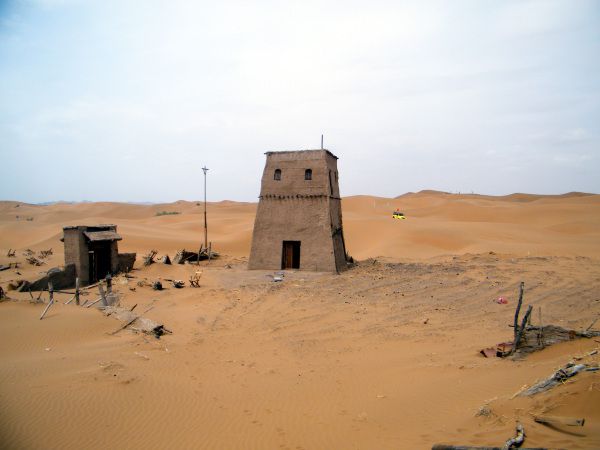 告别了工作人员,我决定还是凭借手机的GPS独自尝试一下。翻过几个大沙丘,一个废弃的碉楼出现在眼前,地上还扔着点瓶瓶罐罐和一顶破草帽,这里是影视剧《风雨沙坡头》的废弃外景地。有越野车在沙漠里玩冲浪,车上坐着受了刺激的游客们,吱哇乱叫声不绝于耳。
