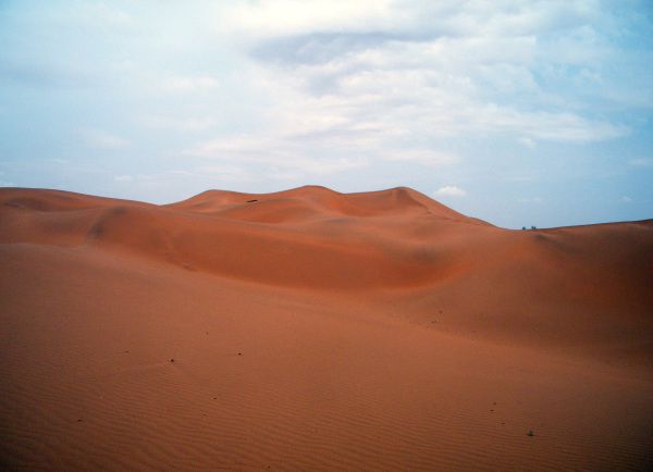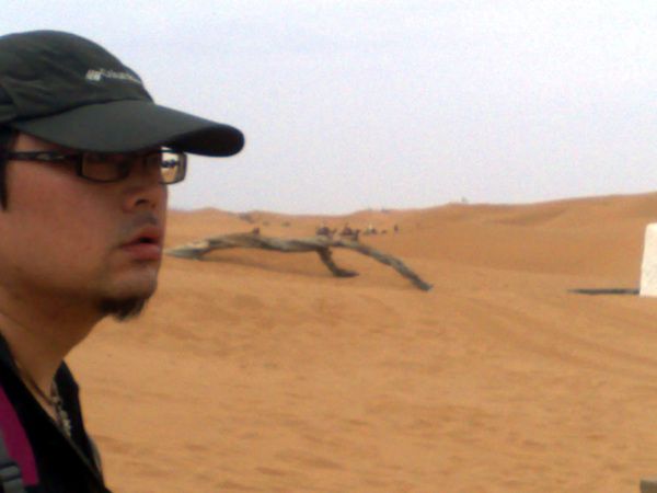 爬上一座巨大的沙丘,卸下行囊躺在滚烫的沙子上,坡顶有很大的风吹过,阵阵吹动我湿透的衣襟。水还剩少半壶,食物是一点儿也没得;裸露的皮肤呼啦辣的疼,红肿的胳膊起了一层被灼伤的小疙瘩;一抬脚,发现双层鞋底被沙子烫得开胶了少大半,每只前面都张开了嘴巴。