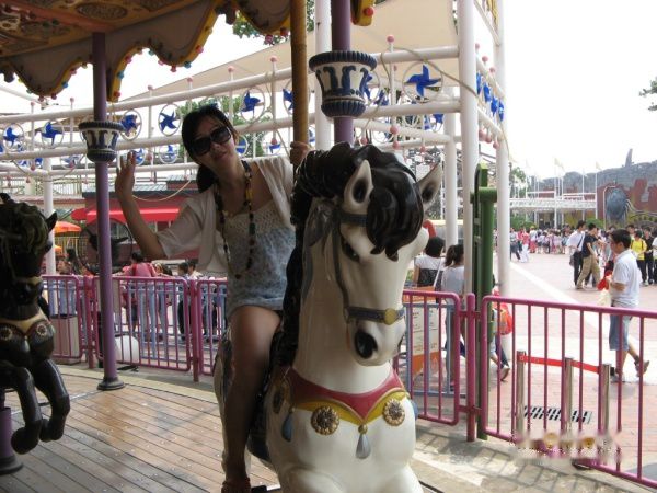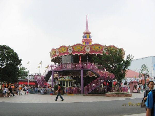 往右第一个映入眼帘的是欢乐时光的“旋转木马”,让我想起了当年在香港迪斯尼坐第一个项目也是它。眼前这个好像更漂亮,还是个双层的。