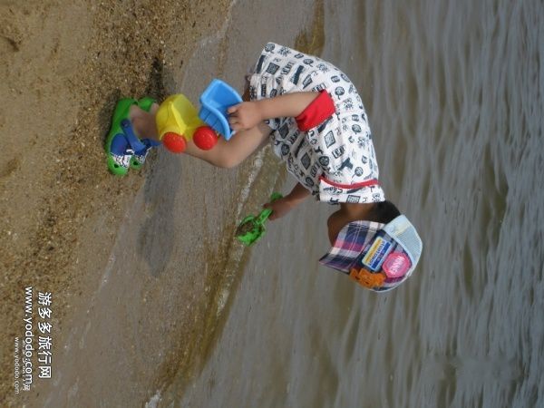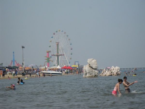 听说金山沙滩开始免票了,今天天气好赶快去体验一下。由s4接金卫公路很顺利到海边。果真是金沙碧海。几十米的海滩铺满了细细的金沙,海水很清,蛮干净的。水最深处有1.6米从浅滩到深水约100多米。1.6米处隔50米有救生员坐在高台上,督促游泳的人不能越线。管理还行。活动项目很多。摩托艇,水上自行车,飞天轮,划船等。小孩子在岸边走走也很好。真是夏凉的好去处。