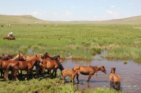 第二天才是行程真正开始的时候,虽然严重感冒但精神不错,车子穿过市中心只需短短的几分钟,路边的建筑不值一提,玻璃窗透出店里的各类商品基本不会入南方人的眼。车子慢慢驶出城市,草原的气息就来了,刚出芽的小草只有寸长,但足矣给大地披上绿地毯,可惜六月的季节没有花开,花儿是女人的情结,没有了她,欣赏草原的兴致一下就淡下来了。还好有那些嬉戏玩洒的马群、悠然吃草的奶牛,咩咩的羊儿,时不时的结伴穿往于公路,他们才是草原的主人,我们只是匆匆而来的过客。