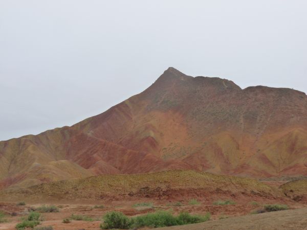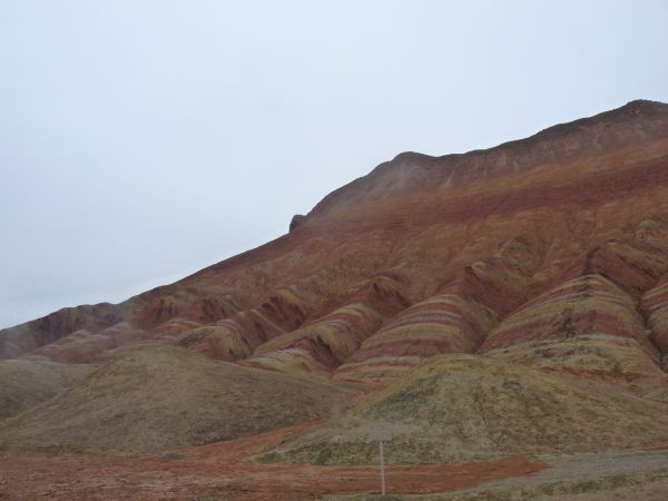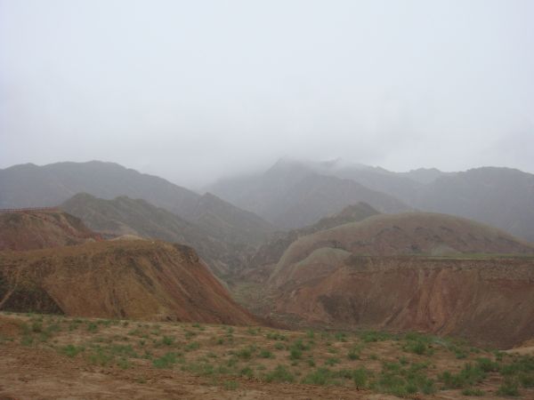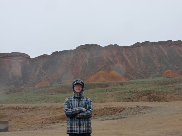 早晨出发,到临泽汽车站,搭了八点半的班车去了七彩丹霞景区,所谓清明时节雨纷纷,路上行人欲断魂说的大概就是那时候我们的心情。路上很多人下车了,只有我们俩个SC到了终点:丹霞景区。可能是因为雨天,加上周一,没有游人的缘故吧。进了丹霞景区,天冷得很,糊里糊涂买了门票进去了(学生票一人20元,全票一人40元,游览车没有优惠,20元一个人)。一开始觉得一路上都是黄土荒山没啥好看……不过到了第一个观景台的时候,山上居然下起了雪!……哎,也算是弥补了我的一个遗憾吧,从来没看过雪,今天可算遇上了。不过是小雪,很小很小。。。从观景台看下去,各处红色砂砾岩的山体有形态各异的花纹,黄的、红的、绿的,虽然是雨天,不过也很漂亮,相比在阳光下必然能大放异彩。气温4°,居然也能下雪。。。回到游览车上,继续往前走,在另一个丹霞地貌停下来,原来……这里才是景区精髓之处!只见各处山体呈断壁残垣状,颜色各异,颇有大漠之风。下了车,兴奋滴拍照啊,跑啊跳啊……搞到脚上全是泥就上了车……接着坐车去到麻子面馆,就是张艺谋拍的一部武侠片建造起来的,造价60万。这面馆确实就有古代客栈的风格,再加上背景是连绵的丹霞山,感觉一下子进入了武侠世界!下车,拍照……爽!但是,冷……