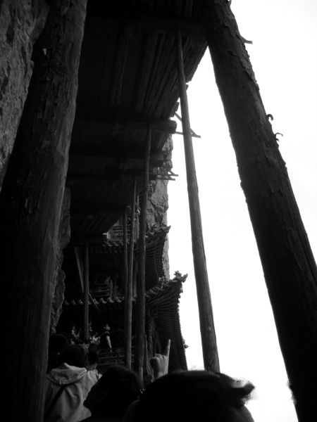 不知道是不是早晨吃了鸡蛋的缘故,坐车坐的很不舒服,还好在我就快受不了的时候车子到了今天的第一个景点——悬空寺。这个让我期待已久的地方啊,我知道同行的驴友多数是冲着恒山来参加这次旅行的,但我是冲着悬空寺来的。早先在电视和网络看过很多关于它的介绍,对它屹立于山间千年不倒的奇迹感到惊叹。有一年几个德国游客来此参观,却突然遇到地震,吓坏了在寺中参观的这几个外宾。但最后大家惊奇的发现寺庙竟然毫发未损。这更让人们感到悬空寺的神奇。这座完全用榫卯结构建筑而成的木式寺院历经千年依然完好,每天接受着无数游人的膜拜。