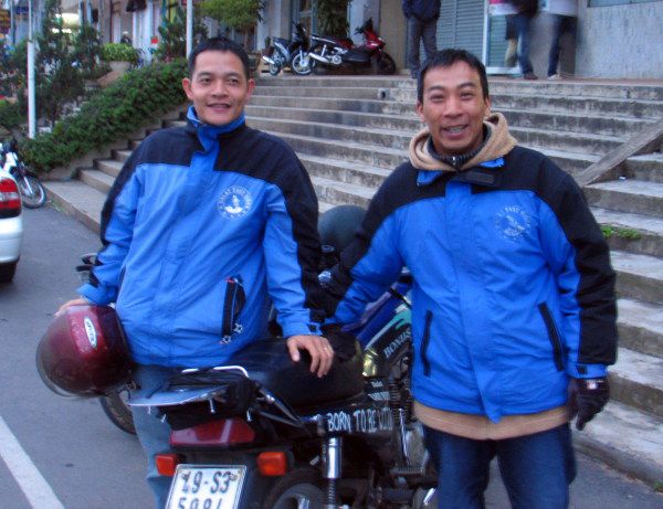 交出护照入住手续就算办完了,老板娘给了张大叻一日游和半日游的行程表给我们看,由于表上都不包括我们要去的疯狂屋,我们决定自己出去看看。开始我们打算租摩托自驾游,但看了那里的道路,再说我快有十年未开过摩托了,还要带个人,而路标的字一个都不认识,难度有点大,最后还是打消了这个想法。还好,当我们在街上东张西望的时候,有一个摩托车手过来用英语和我们搭话,由于出来之前在一个攻略中有人提到这里有一支出租摩托车队很活跃,很多车手都懂点英文,所以还是大胆的停下来与他交谈。他开出的价钱是20美元包一天,我们指着旅游手册的景点一个个问,有些太远去不了,能去的大约的十一个,油费和午餐他们自付,由于当时天已暗下来了,也不可能再找其它人,只好成交,把我们住宿的名片给了他,约好第二天早上8:30来接我们。这就是我们租来的车夫,其中左边这个还有一些中国血统,外婆是中国人,会讲几句中国话。左边这个英文比较好,他还说可惜我们的英文不好,不然他可以给更多的资讯给我们。真够搞笑的。他们来自大叻的农村,凭良心说,他们的职业水准比我们国内这一行业的从业人员高很多。每到一个景点他都会带你到入口告诉你从那进去在那里出来,他在那里等我们。如果语言通的话他还能给你做讲解。我们参观得比较认真,十个景点一直搞到下午六点多才完,天都快黑了,分别前给他们拍的这张照片都要的闪光灯了。