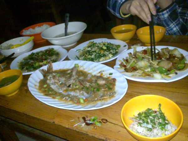 这个是我们的晚餐。剑河鱼68,步步高炒肉末38,山韭菜炒蛋38,回锅肉58,紫菜蛋汤28,米饭10元(管3人饱)。很鬼,但在山上是有心理准备的。