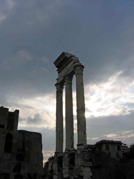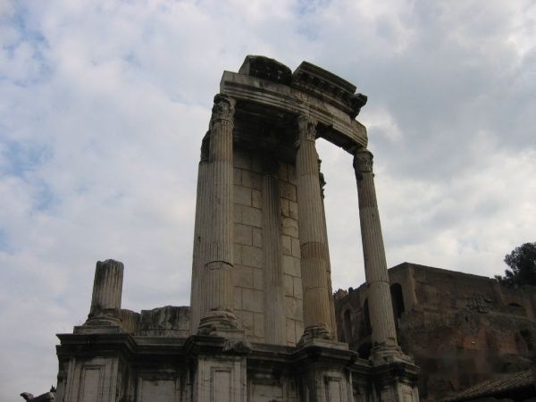 路左远处矗立着的八根圆柱是萨杜恩农神庙(Tempio di Saturno)的遗迹。它落成于公元前497年,是罗马最有名的神庙之一,曾是国库所在地,恺撒当政时期曾贮有13吨黄金、114吨白银和3000万枚银币于此。