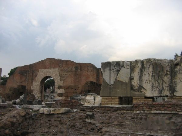 再往前,路右有块很大的石刻,上有碑文,旁边砖墙上还有门洞,是艾米利大圣堂(Basilica Aemilia)