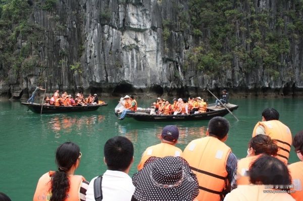 下龙湾是美丽的,人们的心灵也是善良的。正是如此善良之心,让游客享受着那份宁静和快乐。记得,几艘手划小船穿过一个水下隧道的时候,每首小船的游客都屏住呼吸,羞答答的看着身边滑过的船儿,心里各自揣测游客的国籍。可能是某小船上,发出几声细细的中国普通话声调,被邻船游客听见,瞬间集体发出轰雷般笑声,“哈哈哈,也是china!”,“哈哈哈,也是china!”……他国遇乡音,彼此放开心情,有高歌,有哨音,有鼓掌,更有君发出嚎叫声,在天然形成的山涧水深,回音四起。记得同船游客说:“嘿,这么嚎叫,可别把狼喊来。你的叫声太有造诣啦。”