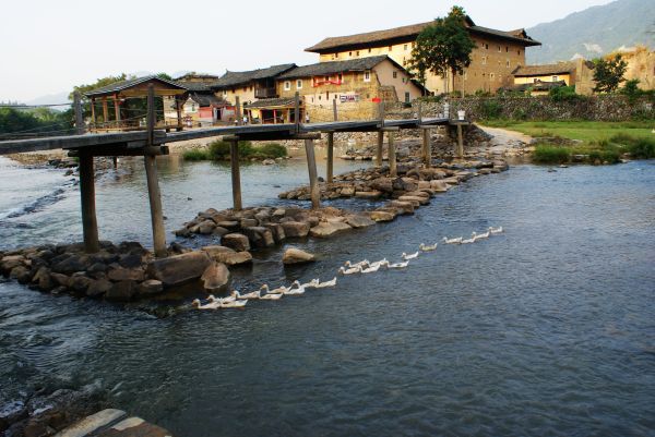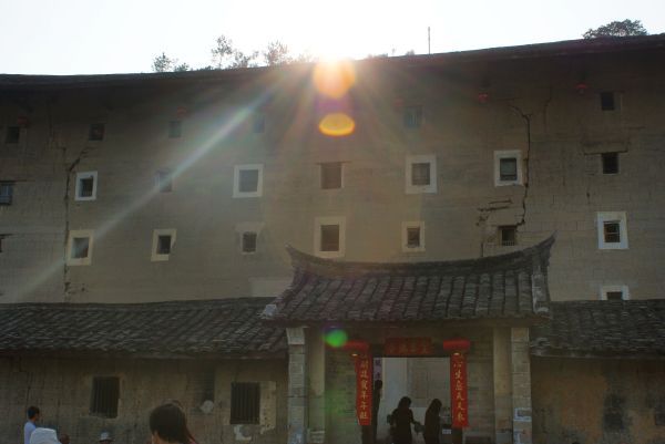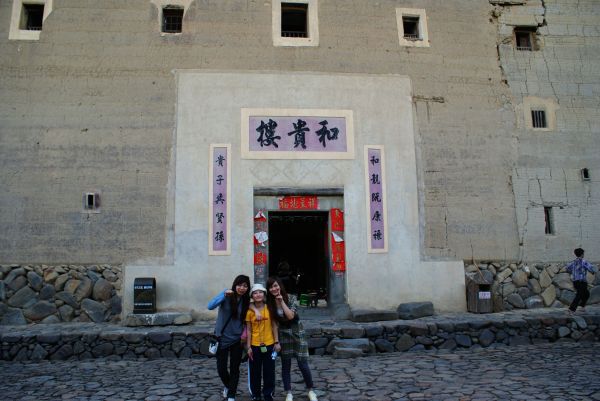 只因为看到浩子去土楼的一小片段,我们就决定去亲眼见识下。连续上了七天的课拖着疲倦的身体,我们出发了。少了以往的兴奋,或许并没什么期待。从网上认识了小辉,他负责接待我们,所以也少了许多麻烦。车子晃了三个半小时才到,幸亏我不晕车,要不后半段走的都是山路,那可是十八弯啊!到那的时候刚好中午,在观景台上看了“四菜一汤”的全景,就去小辉家吃饭了。小辉家就是“四菜一汤”里的文昌楼,一进去就听到妮和枫的尖叫声,这两一个怕狗一个怕鸡的,土楼里面到处都是家禽,害得我跟玉红走在前面一个赶狗一个赶鸡的。小辉妈准备了四菜一汤,标准的农家菜。吃完我们就去逛了一下其他的土楼,基本上的大同小异,所以很快就结束掉赶往下一站。小辉做我们的司机兼导游,下一站和贵楼。从地图上看好像土楼群都连在一线,实际上每个地方都相隔好几公里,坐在车上我们开始感受路边的风景,有说有笑气氛一下子嗨了起来,到达和贵楼差不多三点多,太阳光不是很强烈,那一片风景很好,一大片金黄黄的稻田,虽然不是绿油油的,但看起来也不错。接着我们到了云水谣,天啊,那真是美翻了。木桥,流水,还有漂流的鸭子,以及百年老榕,还有幽长的古道,灵山碧水,这名字真的是改的好啊!写生的学生也超多的,这也成了一道风景。游云水谣正好是傍晚,最美时刻,我们有幸没有错过。云水谣把我们迷得忘了时间,幸亏小辉打电话提醒我该去怀远楼了,要不天黑了,就看不到景色了。真是惊醒梦中人啊,我们赶忙一路小跑赶往怀远楼,一切刚刚好,土楼人家在煮晚饭,从远处看土楼里飘出了缕缕青烟,加上前面的稻田,构成了一幅美景。我们在稻田里玩耍了一下,然后进怀远楼参观了,里面都差不多,外面的景才是最美的。B线游玩已经天黑了,坐上车赶往我们的住处,塔下村。看到这么多美景,我们的心情好翻了。到达住处,叔叔阿姨开始煮饭给我们吃,我们住在四楼,就只有我们四个,小阳台成为我们的专属。稍微整理了一下,阿姨就端菜上来,可惜饭还没煮好,于是我们就先吃菜,没想到一下就把菜吃完了,饭还没煮好,于是我们就坐在阳台上聊天,吹吹风。土楼昼夜温差很大,一到晚上就冷得要命,不过天气不错,满天星。塔下村是一条河贯穿整个村,所以流水声很大,后来叔叔送了几个柿子给我们吃,吃着柿子,聊着天,看着星星,听着流水声,真是一件惬意的事。吃完饭叔叔建议我们去走走,看看夜景。于是我和枫就出去逛了了,枫说这里的夜景给她的感觉像在丽江。村不大,很快就逛完了。回到住处没多久就开始准备睡觉了,可能这一天太累了,而且我们说好明天要早起感受这里的早晨。