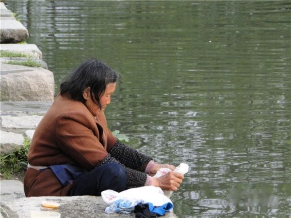 日出而作日落而西的老妇,勤快地在湖边清洗衣物: