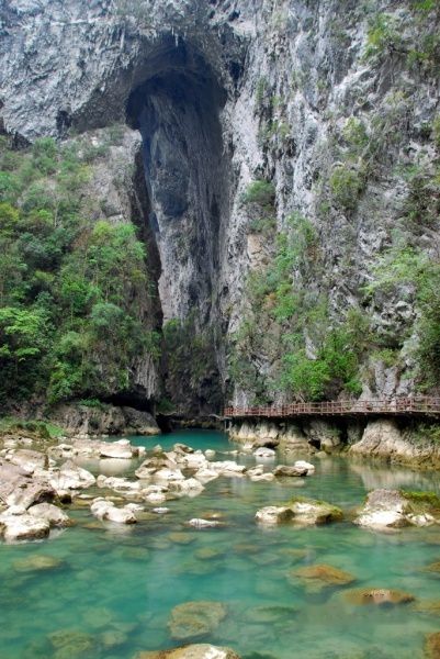 大七孔的门票并不便宜,¥55 per person,不过中国内地的旅游景区门票都是“磨刀霍霍”向游客。不过,初见如此碧绿如此天然的山水,除了惊叹还是惊叹。抑制不住的兴奋,就这样留在CS的大相机里。沿着碧水往里走,一路纵览大七孔的美景。大七孔的游览很直接,风景都在一条路上,沿着修好的路往前行即可。印象最深的是天生桥,很雄壮,大有“天生我才必有用”的气势。妖风洞是整个游览的尽头,还没到妖风洞就有一阵凉意扑面而来。只是可惜妖风洞还在开发,大七孔的游程在这里被迫终止。CS和我研究了半天攀越过密密匝匝的铁栏杆然后进入洞穴继续探险的可能性,最后他的结论是如果他一个人可行,加上我不可行,~!#@#@⋯⋯(插一句,推荐一部描述洞穴探险的电影,Sanctum,看完之后仿佛感觉到了妖风洞的凉意⋯⋯)